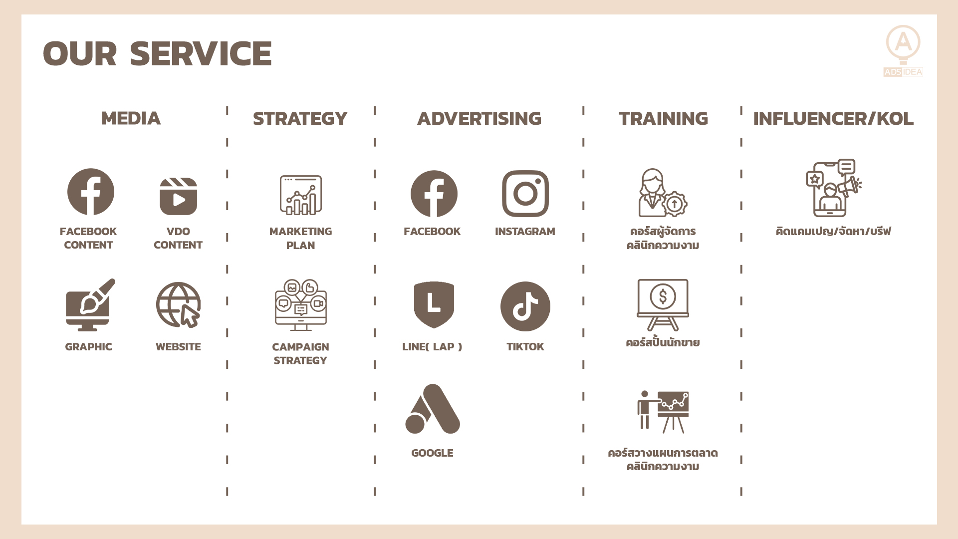 ADSIDEA เองในฐานะ Agency ที่เคยอยู่หลังบ้านหลายร้อยธุรกิจ พร้อมประสบการณ์การบรรยาย และการทำงานร่วมกับหน่วยงานภาครัฐ บริษัทมหาชน และแพลนฟอร์มออนไลน์ต่างๆ เช่น LINE, Google ทำให้เรามีความเข้าใจในการทำการตลาดออนไลน์เป็นอย่างดี เรามีความยินดีที่จะอาสาดูแลการวางแผนการตลาดออนไลน์ และร่วมกันกำหนดเป้าหมายร่วมกันธุรกิจคุณ